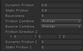 Fiction Diraction 2:The direction of anisotropy. Anisotropic friction is enabled if this direction is not zero. Dynamic Friction 2 and Static Friction 2 will be applied along Friction Direction 2