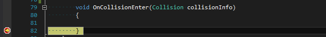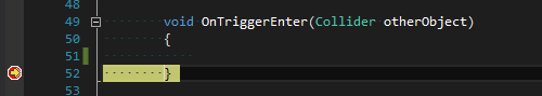 為了驗證碰撞器與(yǔ)觸發器的(de)區別,現設計(jì)一個簡單的遊戲,讓(ràng)小汽車與小球發生碰撞。新建一個(gè)C#腳本文件,把它拖給小(xiǎo)汽(qì)車對象,雙(shuāng)擊該腳本文件進入腳(jiǎo)本編輯(jí)器(qì),在該腳本中(zhōng)加入如下(xià)兩個方法,並分別設置一個斷點: